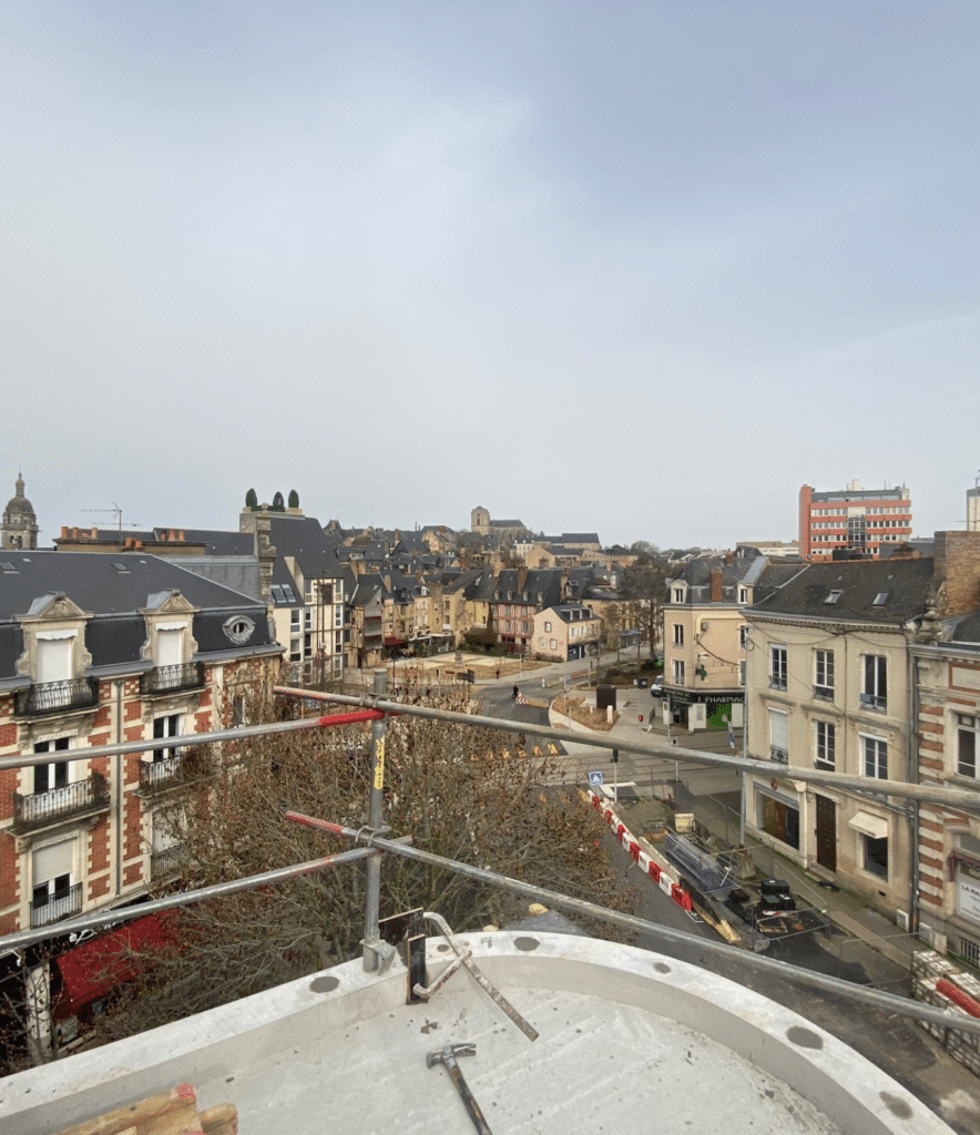 Le chantier de la résidence ORIGINALE avance bien et poursuit son élévation. À ce jour, le gros œuvre progresse avec la construction déjà réalisée jusqu’au 4ᵉ étage sur les 9 que comptera la résidence. Cette étape clé permet désormais de mieux percevoir les volumes du bâtiment et son intégration dans l’environnement urbain du centre-ville du Mans.